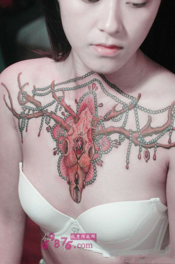 美女霸气骷髅羊头胸前纹身_胸部纹身图案大全_纹身图吧