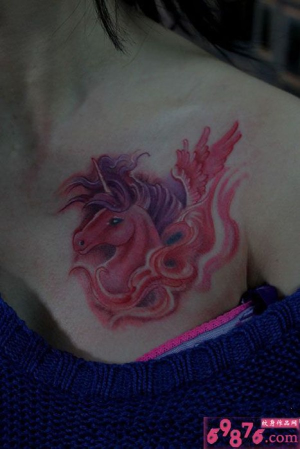 唯美胸口红色独角兽纹身_胸部纹身图案大全_纹身图吧