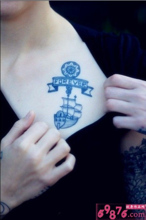 女生胸前蓝色帆船个性纹身_胸部纹身图案大全_纹身图吧