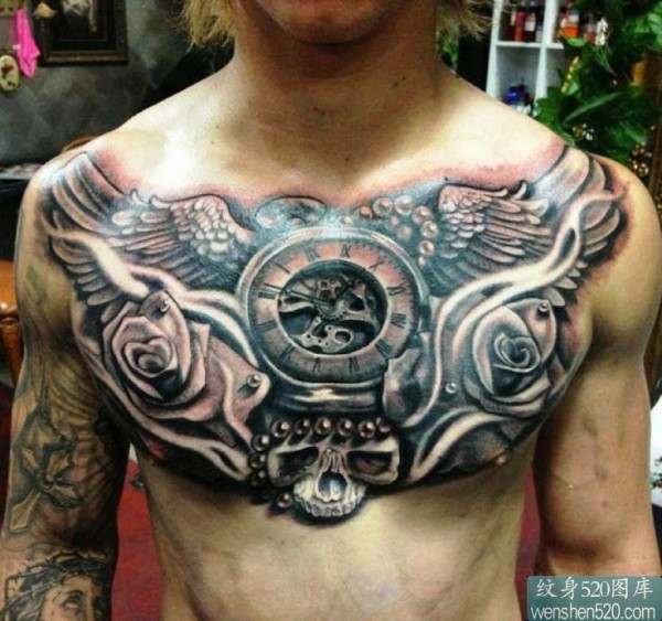 一款非常适合男生的胸部霸气时钟纹身_胸部纹身图案大全_纹身图吧