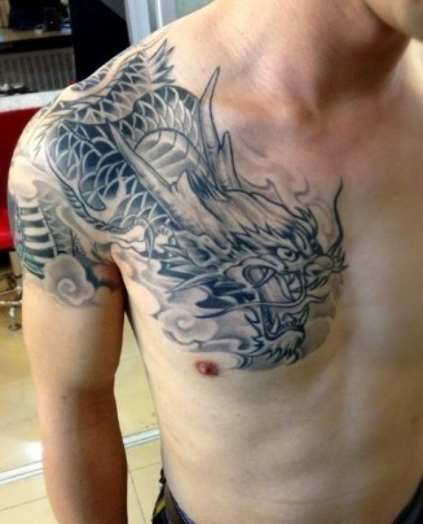 不同色彩胸部搭肩的俯冲姿态龙纹身小编感觉此_胸部纹身图案大全_纹身图吧