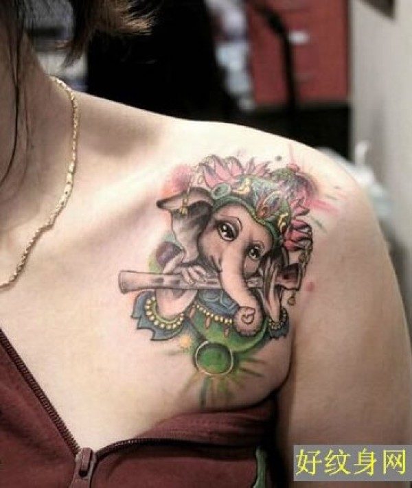 胸部各种风格的象神纹身图案欣赏美女锁骨处彩_胸部纹身图案大全_纹身图吧