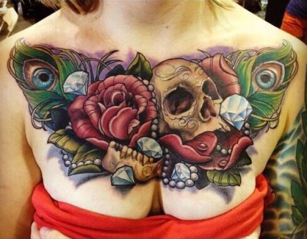 女生胸部鲜花主题骷髅头纹身图案鲜花组合骷髅_胸部纹身图案大全_纹身图吧