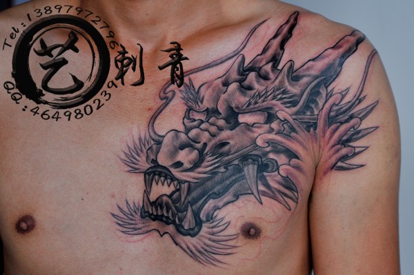 盘踞在男士胸部的龙头纹身经典的龙头纹身图案_胸部纹身图案大全_纹身图吧