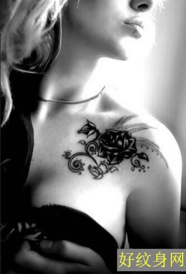 美女前胸锁骨上娇艳的花朵纹身黑白的花朵纹身_胸部纹身图案大全_纹身图吧