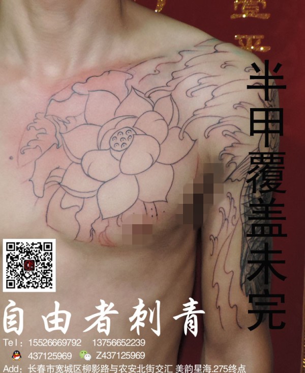 过肩荷花图案遮盖旧纹身胸部荷花图案割线布局_胸部纹身图案大全_纹身图吧