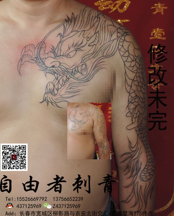 单线过肩龙纹身图案修改过程图片经过修改以后_胸部纹身图案大全_纹身图吧