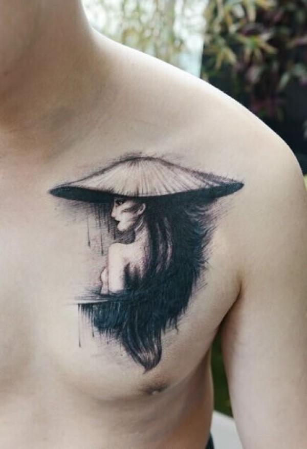 男士胸部的妙龄女郎图案纹身戴着斗笠的美女肖_胸部纹身图案大全_纹身图吧