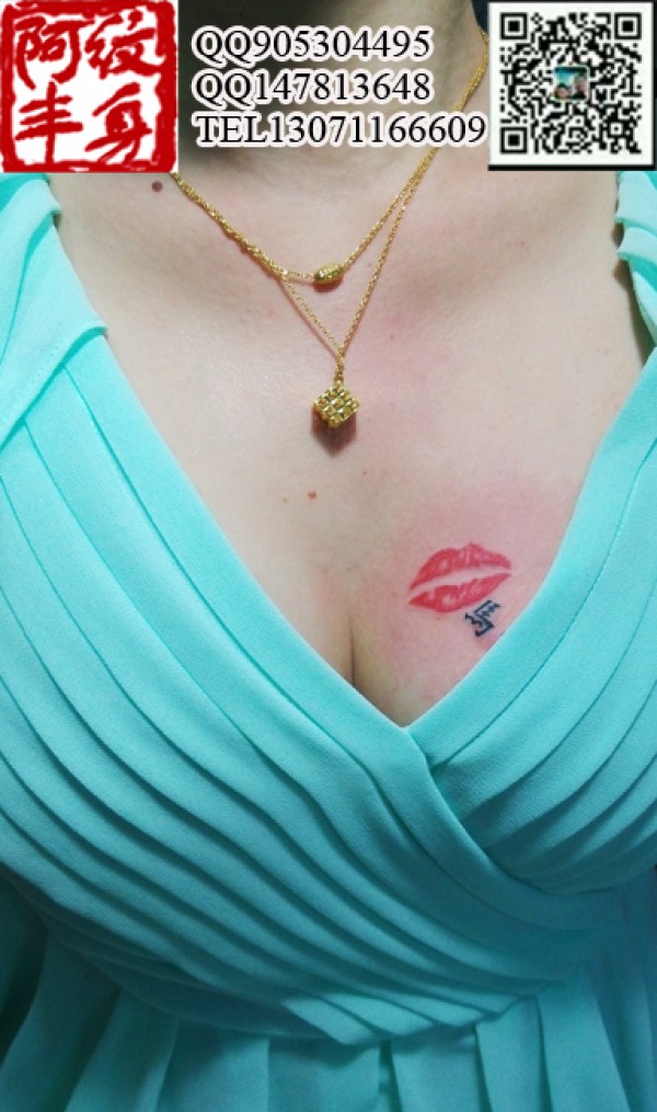 美女胸前性感的红色嘴唇纹身图案红色唇印加中_胸部纹身图案大全_纹身图吧