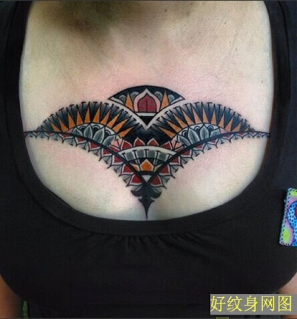美女胸部展开的扇形图腾纹身叠加的扇形图腾纹_胸部纹身图案大全_纹身图吧