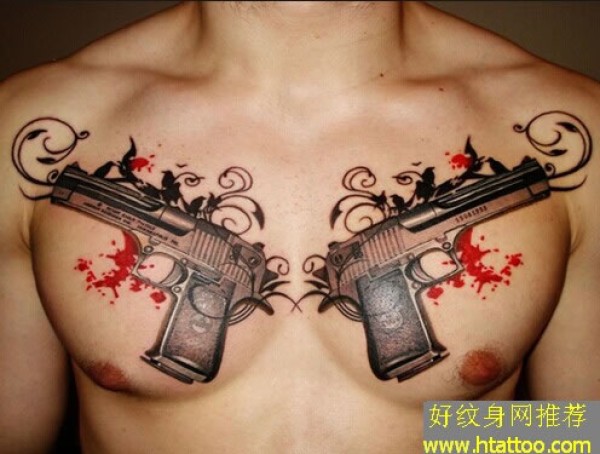 前胸上威力无穷的手枪纹身图男生胸部上的双枪_胸部纹身图案大全_纹身图吧