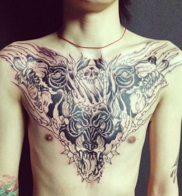 男人胸前超酷凶狠的狼头纹身图案_胸部纹身图案大全_纹身图吧