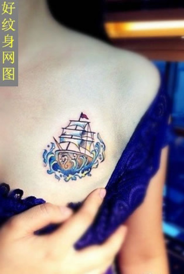 美女胸部小小的帆船纹身图案随波逐流的帆船图_胸部纹身图案大全_纹身图吧