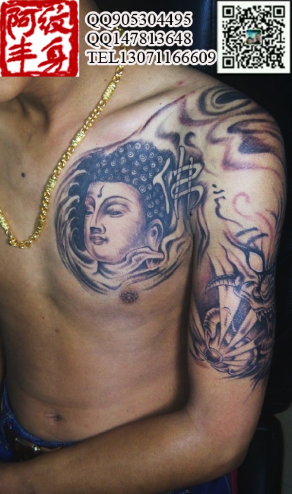 胸部面带微笑的佛像纹身图案胸部佛像半甲纹身_胸部纹身图案大全_纹身图吧