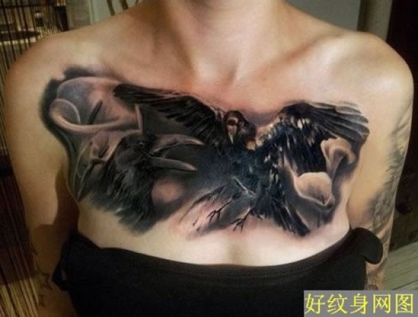 胸部惟妙惟肖的乌鸦纹身图案大全美女胸部黑色_胸部纹身图案大全_纹身图吧