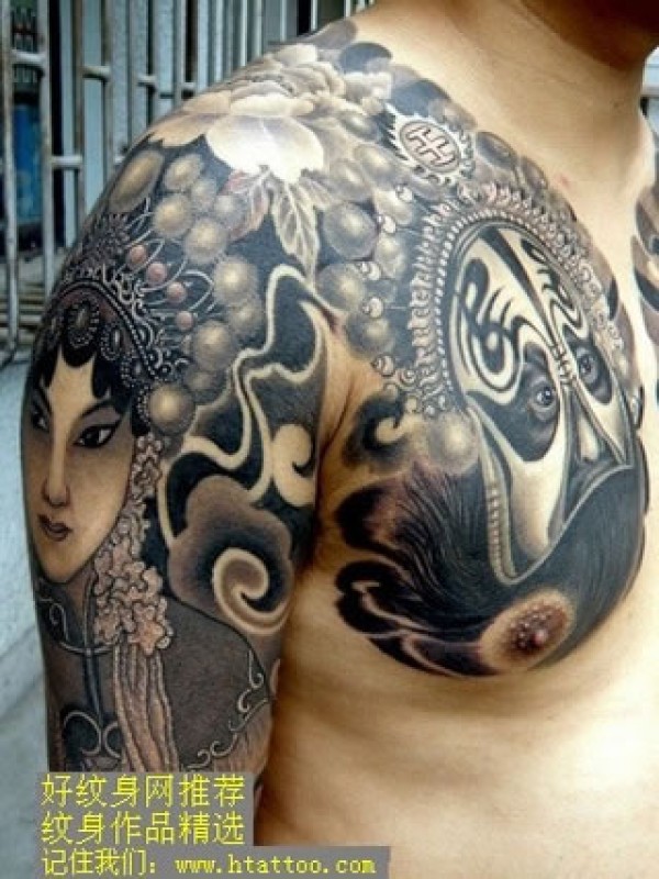 男士胸部的京剧脸谱纹身图案胸部素色的过肩脸_胸部纹身图案大全_纹身图吧