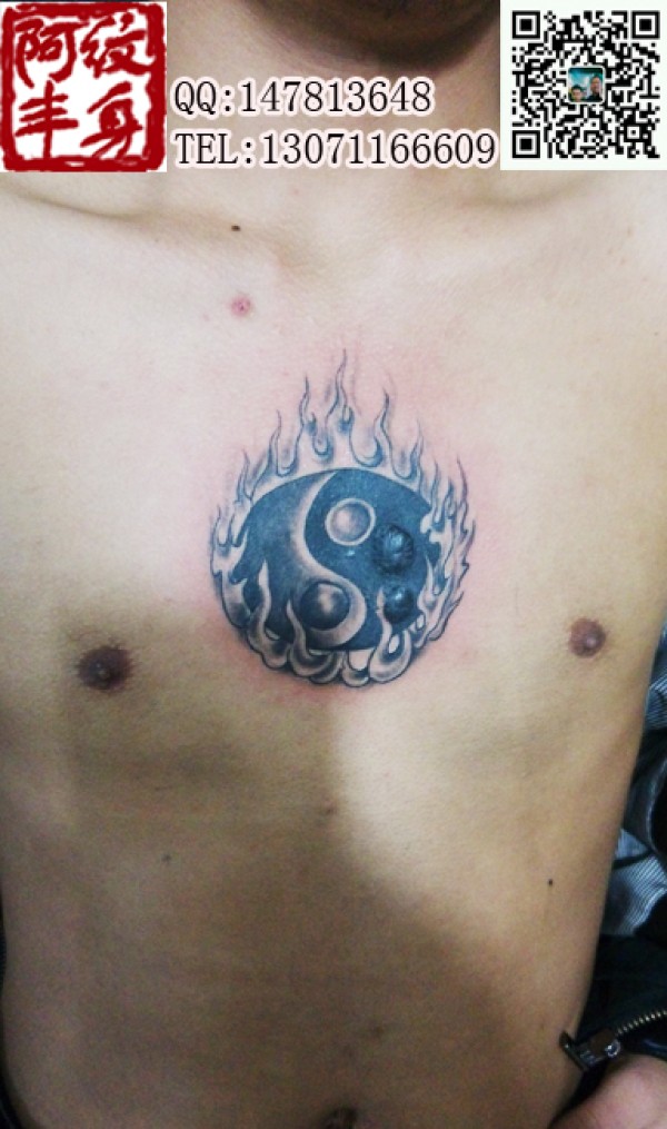 纹身男胸前的太极八卦图案纹身熊熊烈火燃烧着_胸部纹身图案大全_纹身图吧