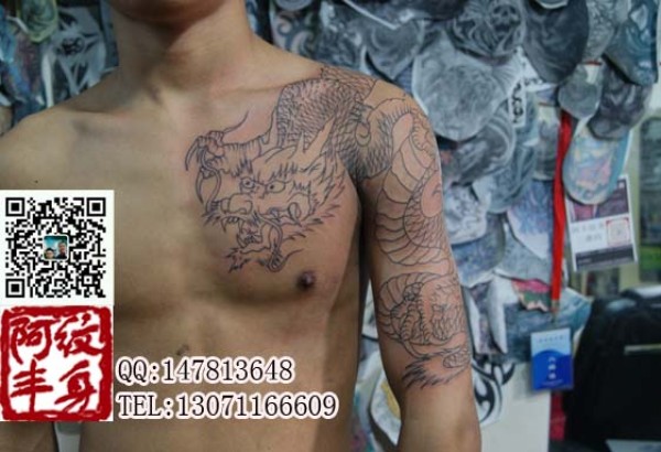 胸部纹身图案,单线条过肩龙纹身单线过肩龙纹_胸部纹身图案大全_纹身图吧