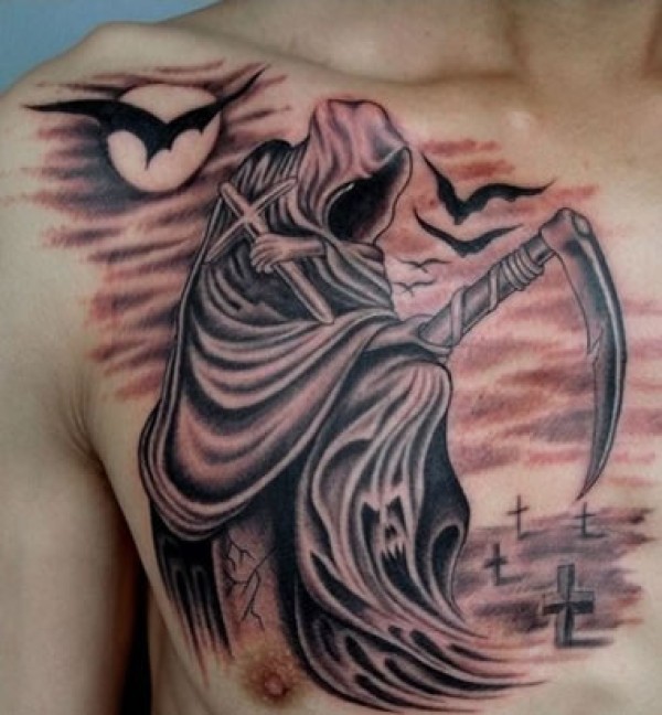 男士胸部暗黑感的死神纹身图案拿着镰刀和十字_胸部纹身图案大全_纹身图吧