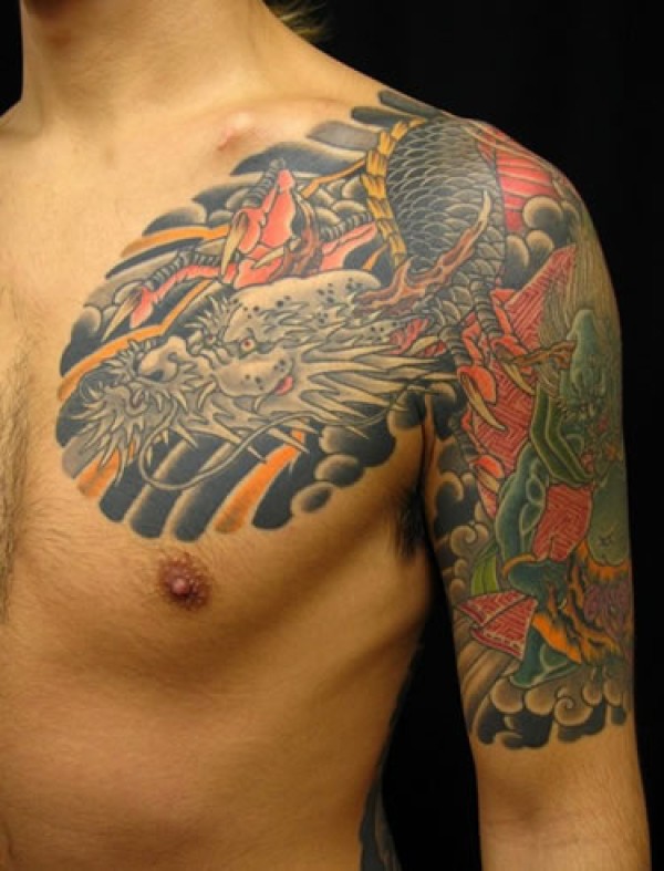 男士胸部神龙图案半甲纹身彩色的神龙图案半甲_胸部纹身图案大全_纹身图吧