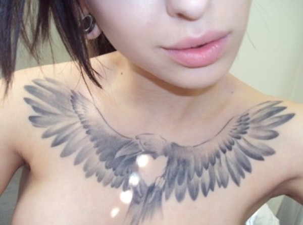 在女生胸部振翅翱翔的乌鸦纹身图素色的展翅乌_胸部纹身图案大全_纹身图吧