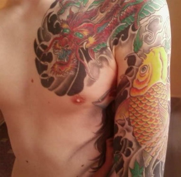 胸部黑底彩绘游龙半甲纹身图彩色龙带金色鲤鱼_胸部纹身图案大全_纹身图吧
