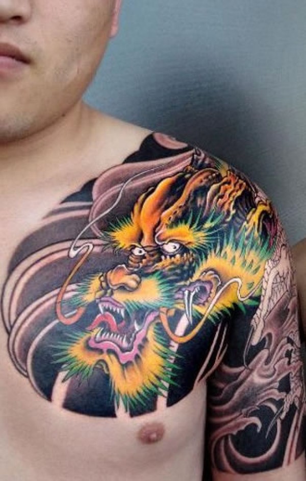 贵气逼人的胸部黄金龙半甲纹身图黑灰色暗底衬_胸部纹身图案大全_纹身图吧
