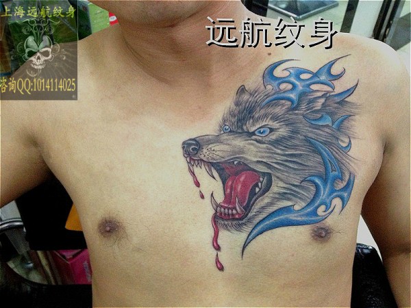 上海远航推荐的利齿滴血狼头纹身带蓝色火焰图_胸部纹身图案大全_纹身图吧