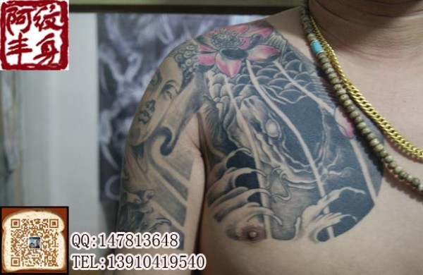 胸前半甲纹身图案设计,海潮中的佛像纹身这样_胸部纹身图案大全_纹身图吧