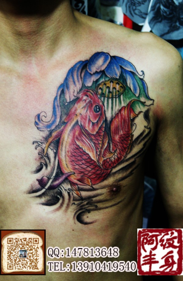 胸部彩色带荷花的红色鲤鱼纹身图案具有非常浓_胸部纹身图案大全_纹身图吧