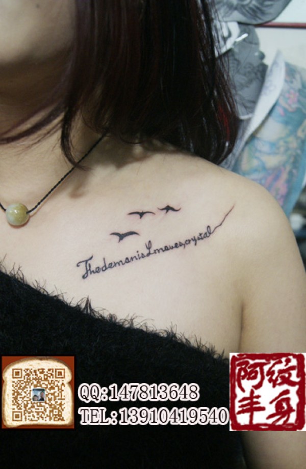 女士胸前的海鸟纹身图案加字母纹身女生胸部黑_胸部纹身图案大全_纹身图吧