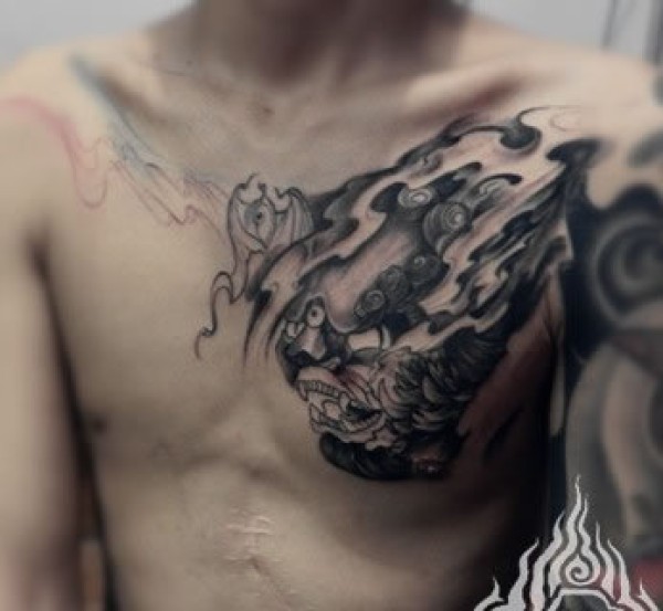 胸部相对的恶魔纹身作品加工过程左胸上带流云_胸部纹身图案大全_纹身图吧