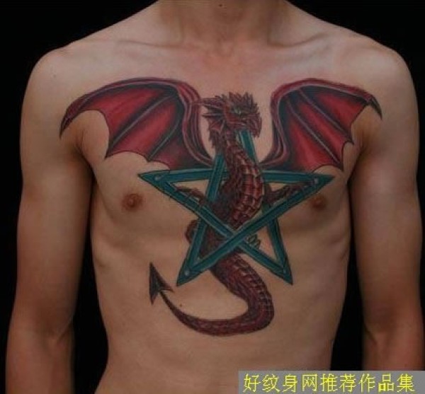 胸部翼龙纹身图案胸部五角星图案中的展翅翼龙_胸部纹身图案大全_纹身图吧
