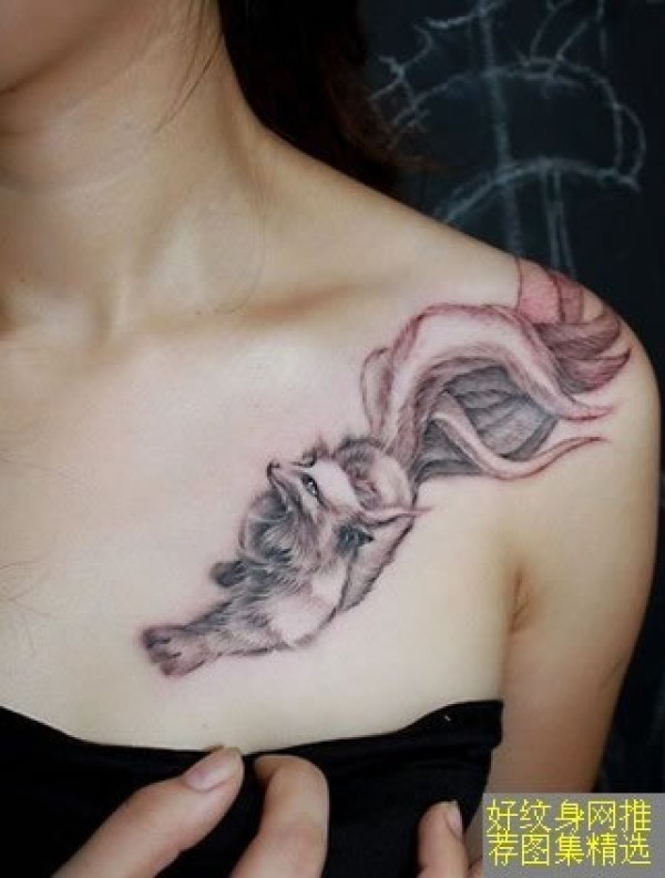 胸部过肩九尾灵狐纹身图女生胸部的九尾狐纹身_胸部纹身图案大全_纹身图吧