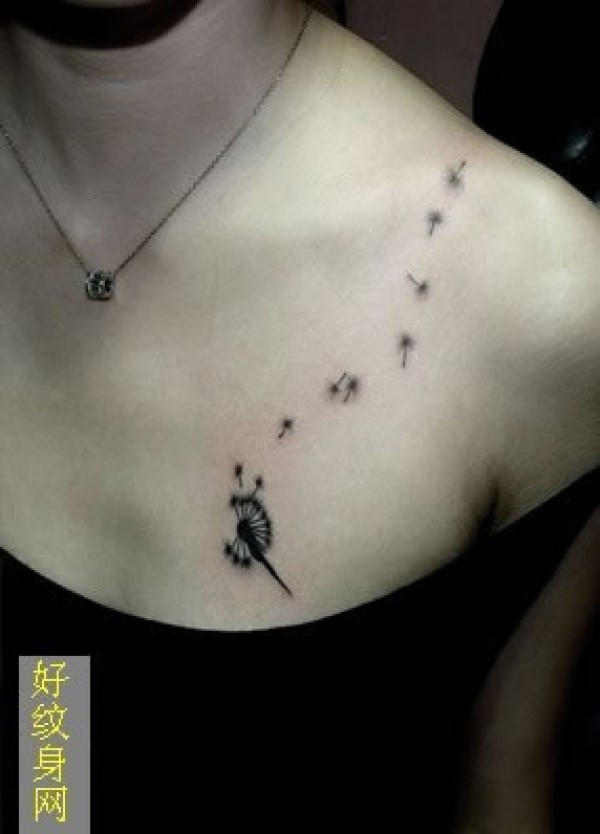 女生胸部黑色的蒲公英图案纹身飘逸的蒲公英纹_胸部纹身图案大全_纹身图吧