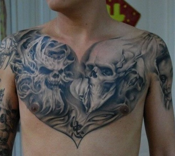 胸部灰白色骷髅头纹身图满胸相对纹身作品,相_胸部纹身图案大全_纹身图吧