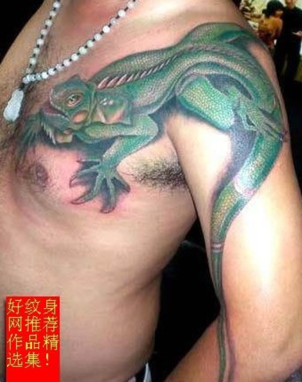 胸部绿色的蜥蜴纹身图胸部过肩蜥蜴纹身作品_胸部纹身图案大全_纹身图吧