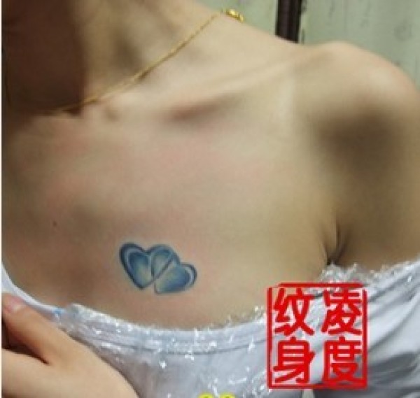 女生胸部蓝色心形纹身图案心心相印图案纹身,_胸部纹身图案大全_纹身图吧