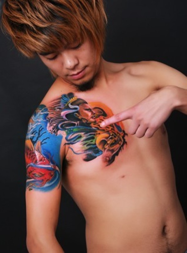 胸部古装人物彩绘纹身,手臂上还有鱼纹身纹身_胸部纹身图案大全_纹身图吧