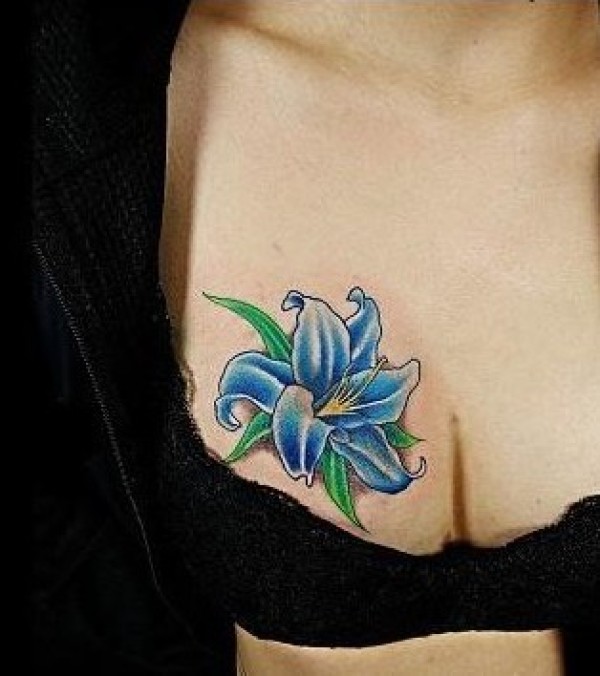 胸部蓝色花朵纹身,盛开的那么惊艳_胸部纹身图案大全_纹身图吧