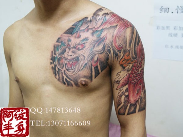 半甲纹身刺青,鱼纹身作品这款魔头加鲤鱼纹身_胸部纹身图案大全_纹身图吧