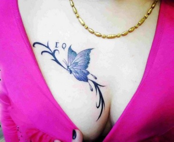 女生胸部紫蝶纹身,令人遐想ing的纹身_胸部纹身图案大全_纹身图吧