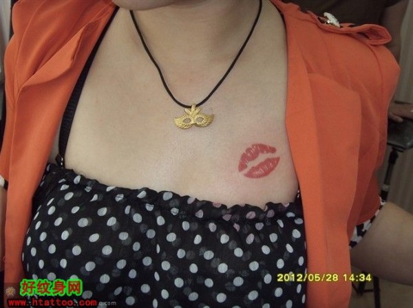 美女胸部的红色唇印纹身,很逼真的感觉_胸部纹身图案大全_纹身图吧