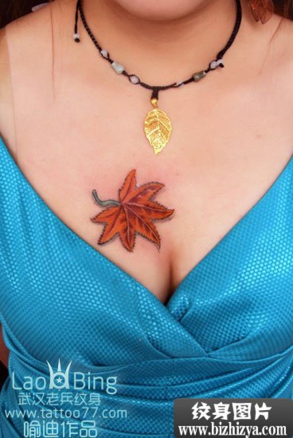 女子胸前的一片枫叶_胸部纹身图案大全_纹身图吧
