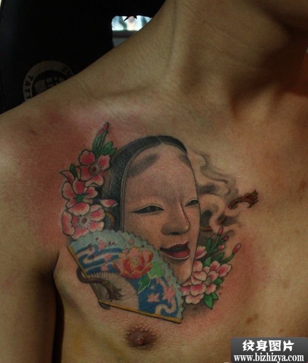 男人胸部艺妓女樱花扇子纹身图案图片_胸部纹身图案大全_纹身图吧