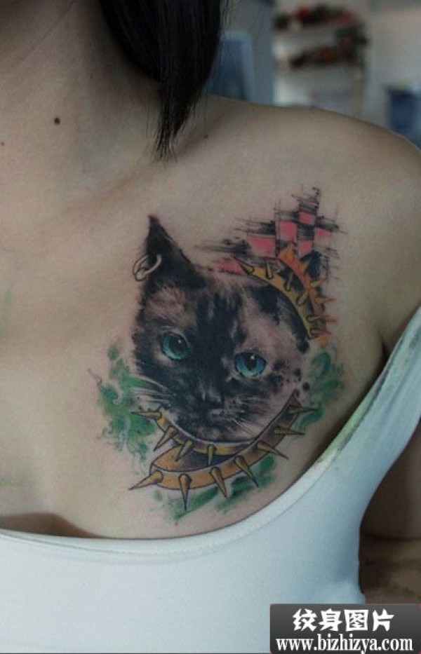 可爱猫咪头像胸部纹身图案图片_胸部纹身图案大全_纹身图吧