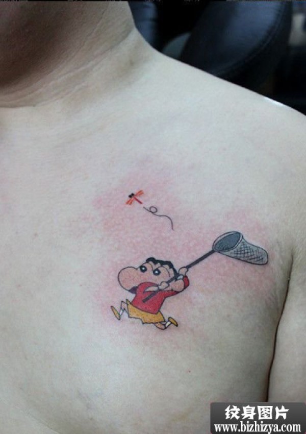 可爱蜡笔小新捕蜻蜓胸部纹身图案图片_胸部纹身图案大全_纹身图吧