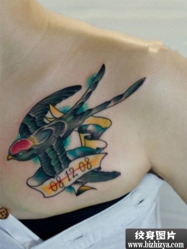 美女胸前漂亮的彩色小燕子纹身图案_胸部纹身图案大全_纹身图吧