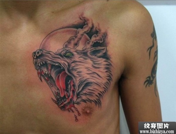 男人胸部嗜血狼头刺青图案图片_胸部纹身图案大全_纹身图吧