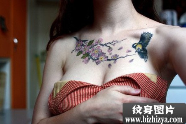 美女胸部梅花与鸟的纹身图案图片_胸部纹身图案大全_纹身图吧